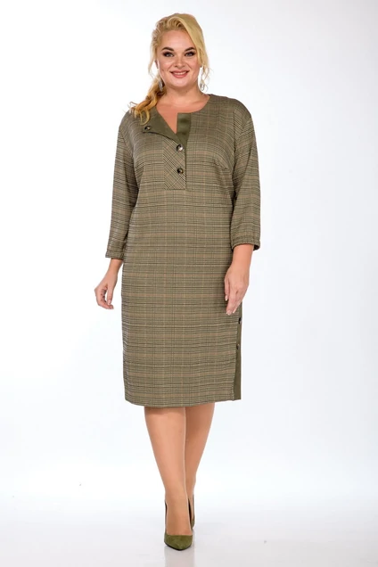 Платье женское прямого силуэта, изготовлено из трикотажного полотна в клетку. Линия плеча слегка спущена. Рукав по низу на резинке. Перед с ассиметричной прорезной планкой с отложным лацканом зафиксированным пуговицей. По боковым обработаны фигурные шлицы из отделочной ткани. Спинка со средним швом.