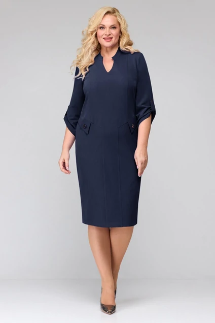 Платье женское прямого силуэта из плательной ткани. По переду рельефы и фигурные подрезы в швах, которых обработаны клапаны и боковые карманы. На клапанах пришиты декоративные пуговицы. По спинке обработаны кокетка, средний шов со шлицей внизу. Горловина фигурной формы со стойкой. Рукава втачные, с регулировкой патой с пуговицей.