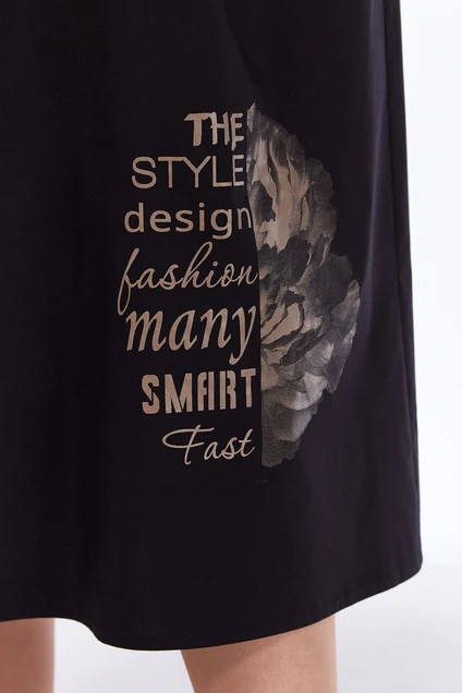 Платье женское, свободного силуэта, выполнено из хлопчатобумажной ткани. Вырез горловины округлой формы обработан кантом. По переду нагрудные вытачки. Перед и спинка разрезные по линии талии и присобраны на легкую сборку. В боковых швах обработаны карманы. Рукава втачные, одношовные с отложным манжетом из отделочной ткани. Пояс платья съемный, выполнен из основной и отделочной ткани. В качестве декора дизайнерская печать.