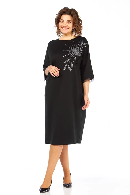 Платье женское, нарядное, изготовлено из трикотажного полотна. Горловина круглой формы, с кантом. На полочке дизайнерская вышивка. Спинка со средним швом и декоративной застежкой вверху. Рукава спущенные, длиной ¾, с сеткой по низу.