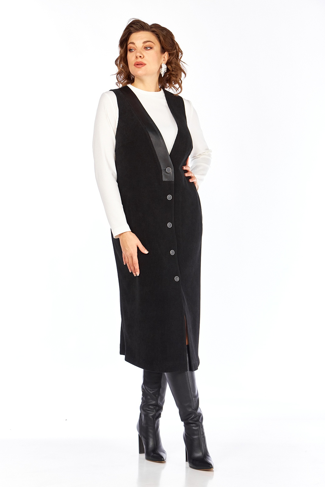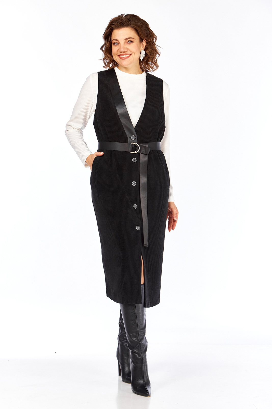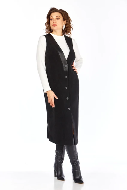 Сарафан прямого силуэта из трикотажного полотна с имитацией вельвета. Горловина V -образной формы с отделкой из экокожи. Застежка центрально — бортовая на петли и пуговицы. По переду нагрудные вытачки и обработаны карманы с листочками. На спинке фигурный вырез. Сарафан на подкладке. Джемпер не входит в комплект