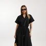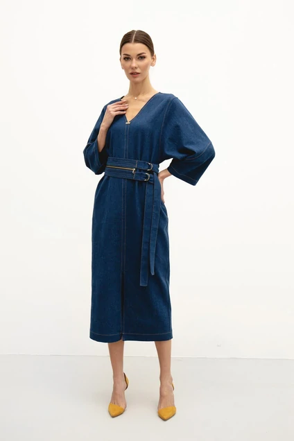 Платье женское прямого силуэта. Перед разрезной, с разрезом по среднему шву. Спинка цельнокроеная. Рукав широкий объемный, выходящий из углубленной проймы. В боковых швах расположены карманы. Все швы отстрочены отделочной строчкой контрастного цвета. Горловина V – образной формы, по центру декорирована пришивным металлическим украшением. Платье комплектуется широким поясом из основной ткани, затягивающимся на металлические полукольца. Пояс декорирован металлической молнией с контрастной отстрочкой. Длина изделия по спинке 121 см.
