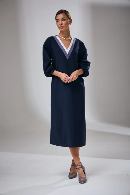 Платье женское прямого силуэта с рукавом покроя реглан. Перед цельнокроеный. Спинка цельнокроеная. Горловина V-образной формы, обработана планками контрастного цвета. В боковых швах обработаны карманы, слева разрез. Рукав объемный, декорирован защипами, по низу обработан узкой манжетой. Пояс в комплект не входит. Декоративные элементы и фурнитура могут отличаться от заявленных на фото. Длина изделия по спинке 119 см.
