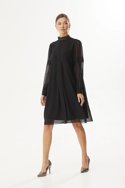 Платье женское А-образного силуэта, двухслойное, нижний слой из ткани-компаньона. По переду платья декоративные складки, верх декорирован кружевом. Рукав втачной длинный, декорирован кружевом в области предплечья, по низу обработан притачной манжетой с кружевом с застежкой на пуговицы и навесные петли. Спинка со средним швом. Горловина округлой формы со стойкой из кружева.