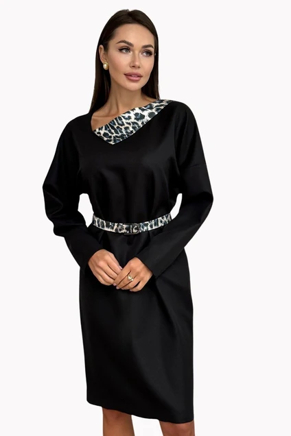 Платье женское прямого силуэта, с отрезным рукавом типа «летучая мышь». Перед цельнокроеный. Спинка со средним швом, в котором обработан разрез. Рукав длинный, одношовный. В боковых швах обработаны карманы. Горловина ассиметричной формы с декоративным воротником по переду. Платье комплектуется съемным поясом с пряжкой. Воротник и пояс выполнены из ткани-компаньона. Декоративные элементы и фурнитура могут отличаться от заявленных на фото. Цвет материала может отличаться по тону в зависимости от настроек вашего монитора! Длина изделия по спинке 100 см, длина рукава от горловины 72,5 см.