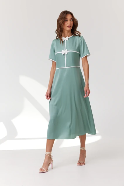 Платье женское полуприлегающего силуэта, отрезное по линии талии.Лиф переда разрезной, со вставками из ткани-компаньона и декоративным украшением в виде бантиков. Спинка лифа с плечевыми вытачками, со средним швом, в котором обработана застежка на потайную молнию. Юбка платья расширенной А-образной формы. Горловина округлой формы, обработана бейкой из ткани-компаньона. Рукав короткий одношовный, По низу обработан бейкой из ткани-компаньона. Декоративные элементы и фурнитура могут отличаться от заявленных на фото. Цвет материала может отличаться по тону в зависимости от настроек вашего монитора! Длина изделия по спинке 119,5 см, длина рукава 25 см.
