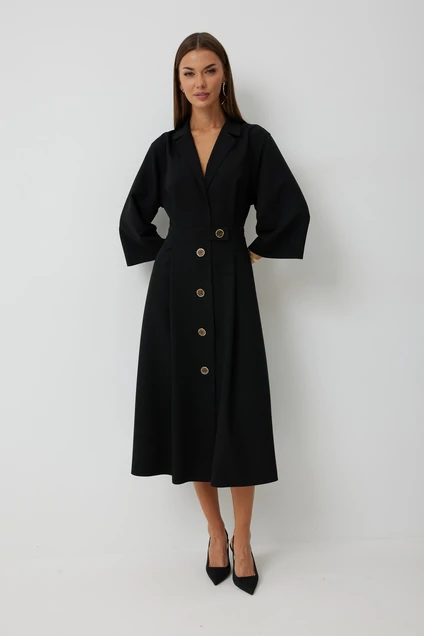 Платье женское полуприлегающего силуэта, отрезное по линии талии с застежкой по центральной части переда на декоративные пуговицы. Платье длиной до середины икры. По отрезному лифу с юбке полочки и спинки заложены складки. Лиф с юбкой соединены втачным поясом, по которому прострочена отделочная строчка. Рукав втачной прямой до середины локтя. По пройме прострочена отделочная строчка. Горловина платья обработана втачным воротником с отложными лацканами.