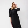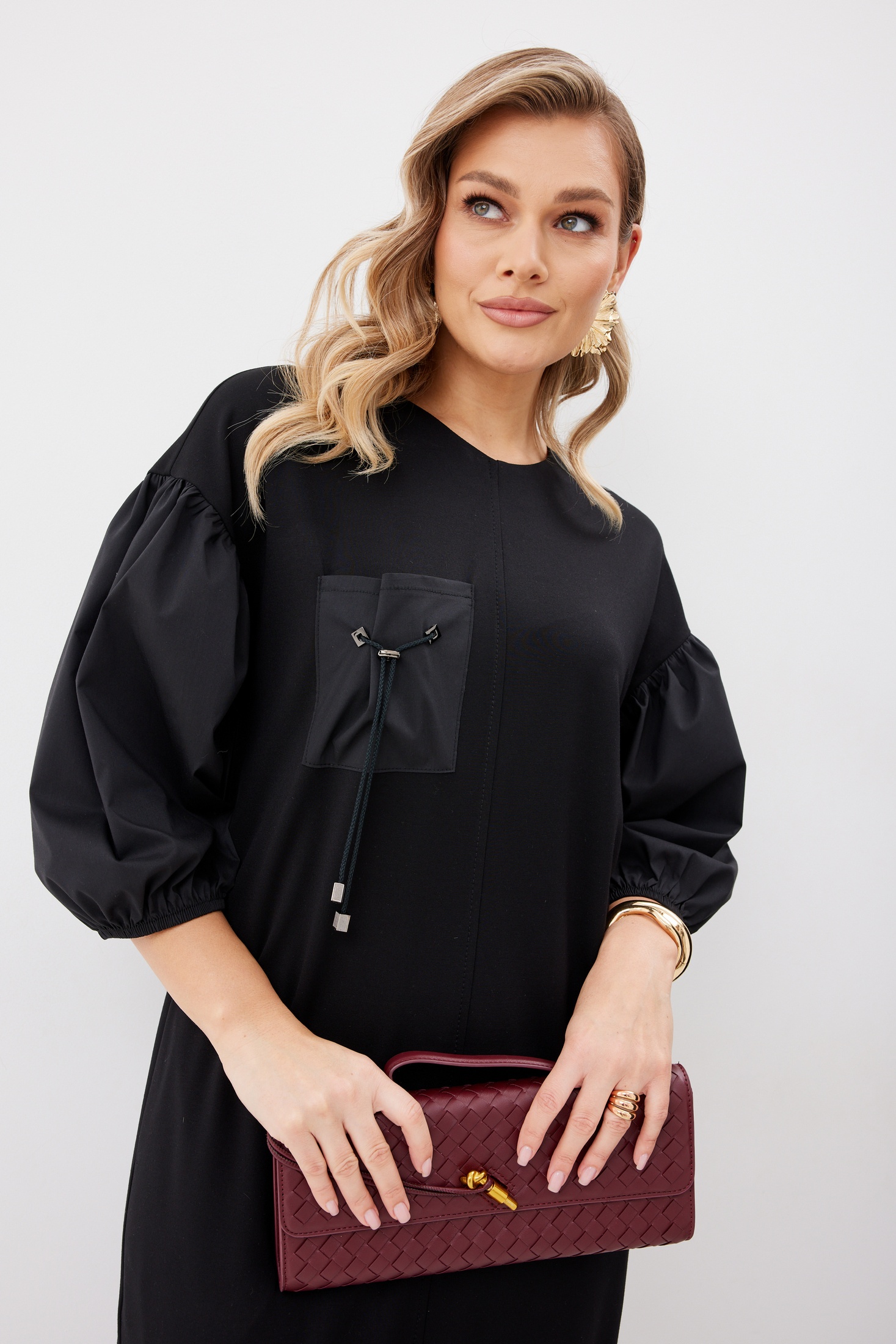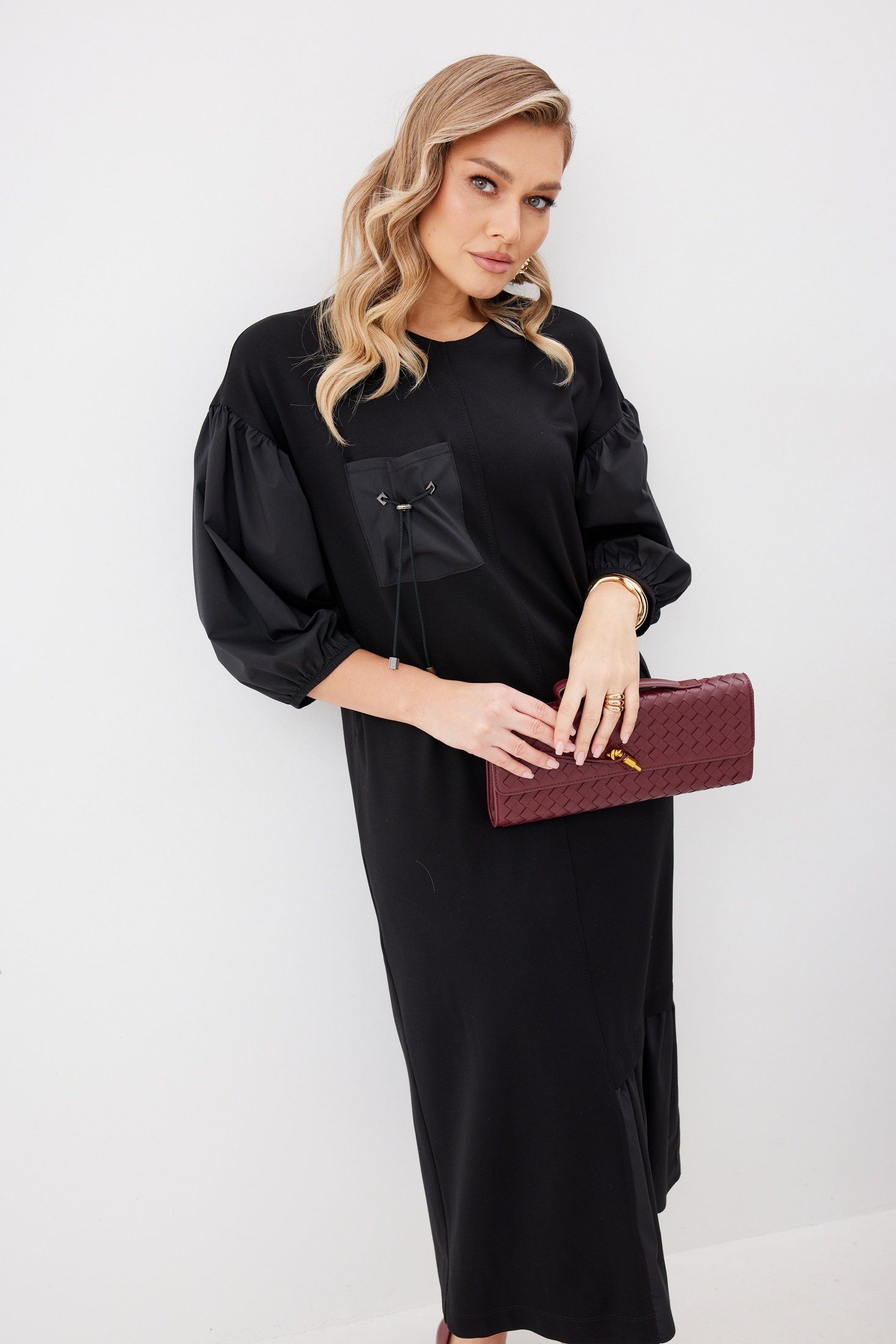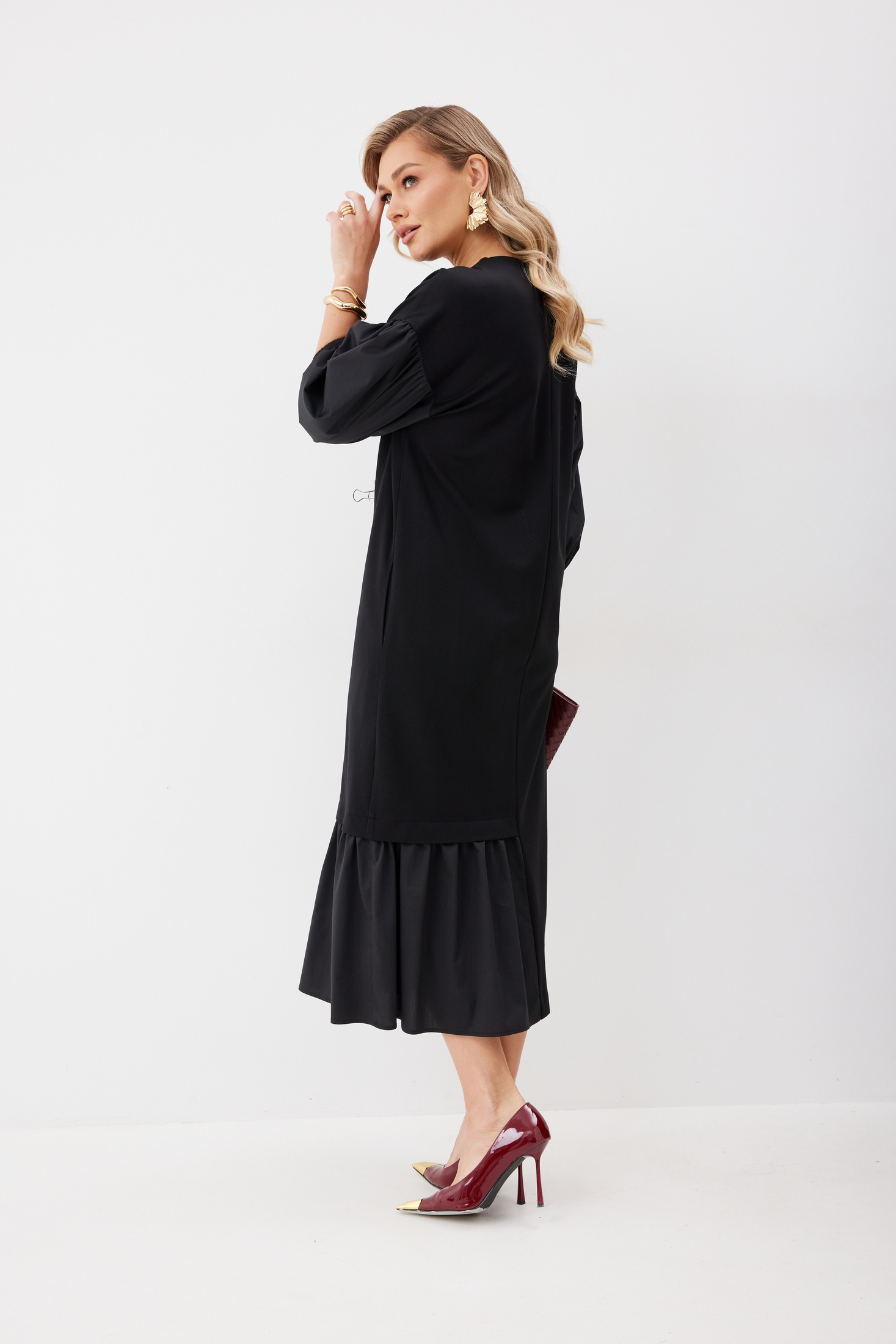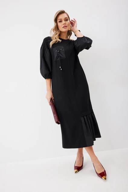 Платье женское прямого силуэта без подкладки из трикотажной ткани длиной до середины икры. Передняя часть платья со средним швом. По левой половинке переда внизу платья пришит волан из ткани – компаньона. По правой половинке переда настрочен нагрудный карман из ткани – компаньона с декоративными элементами. В боковых швах платья функциональные карманы. Спинка платья со средним швом, в котором расположена застежка – «молния». По низу левой половинки спинки пришит волан из ткани – компаньона. Горловина имеет округлую форму. Линия плеча спущена. Рукав выполнен из ткани – компаньона со сборкой вверху рукава и резинкой по низу рукава. Длина изделия по спинке 126 см, длина рукава от горловины 63 см.