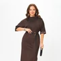 Силуэт полуприлегающий, чуть заужен к низу. Рукав втачной фантазийной формы, низ рукава на резинке, можно регулировать длину. Горловина круглая. По переду полурельефы. Спинка со средним швом, полурельефы, внизу среднего шва шлица для хода. На спинке в верху застежка в форме капли на маленькую петлю и пуговицу. Платье без подкладки.