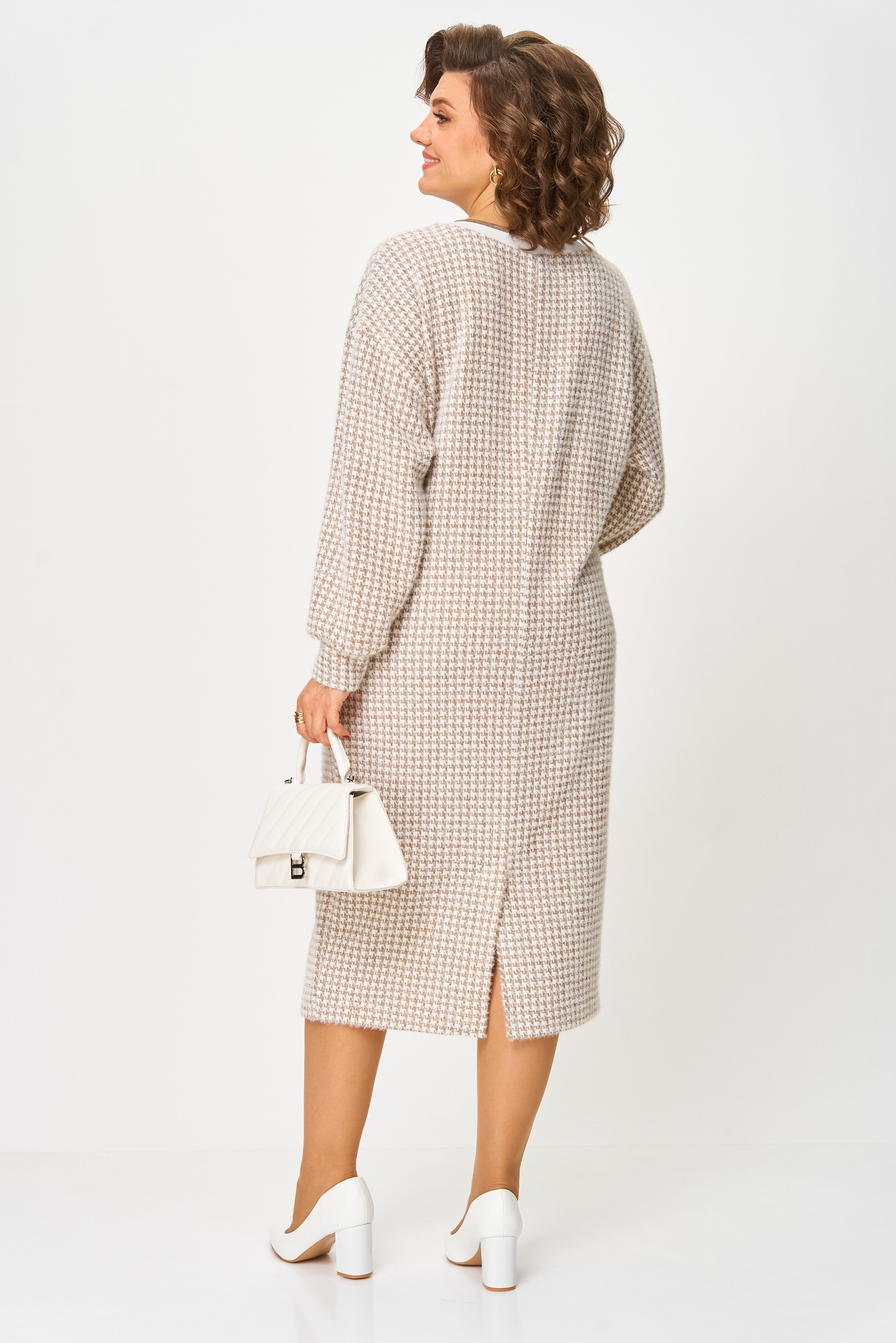 Силуэт платья: лиф свободный в верху и юбка заужена к низу. Горловина овальная обработана довязом. Имитация кармана на части переда. По нижней части переда пришит декор из довяза. Покрой платья свободный, линия плеча спущена. Рукав длинный, низ рукава на манжете.