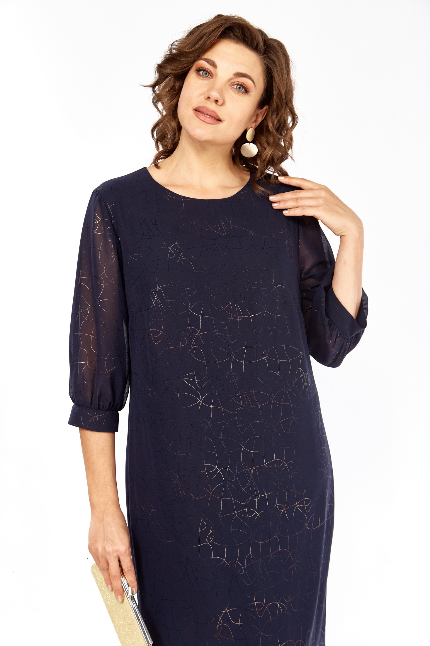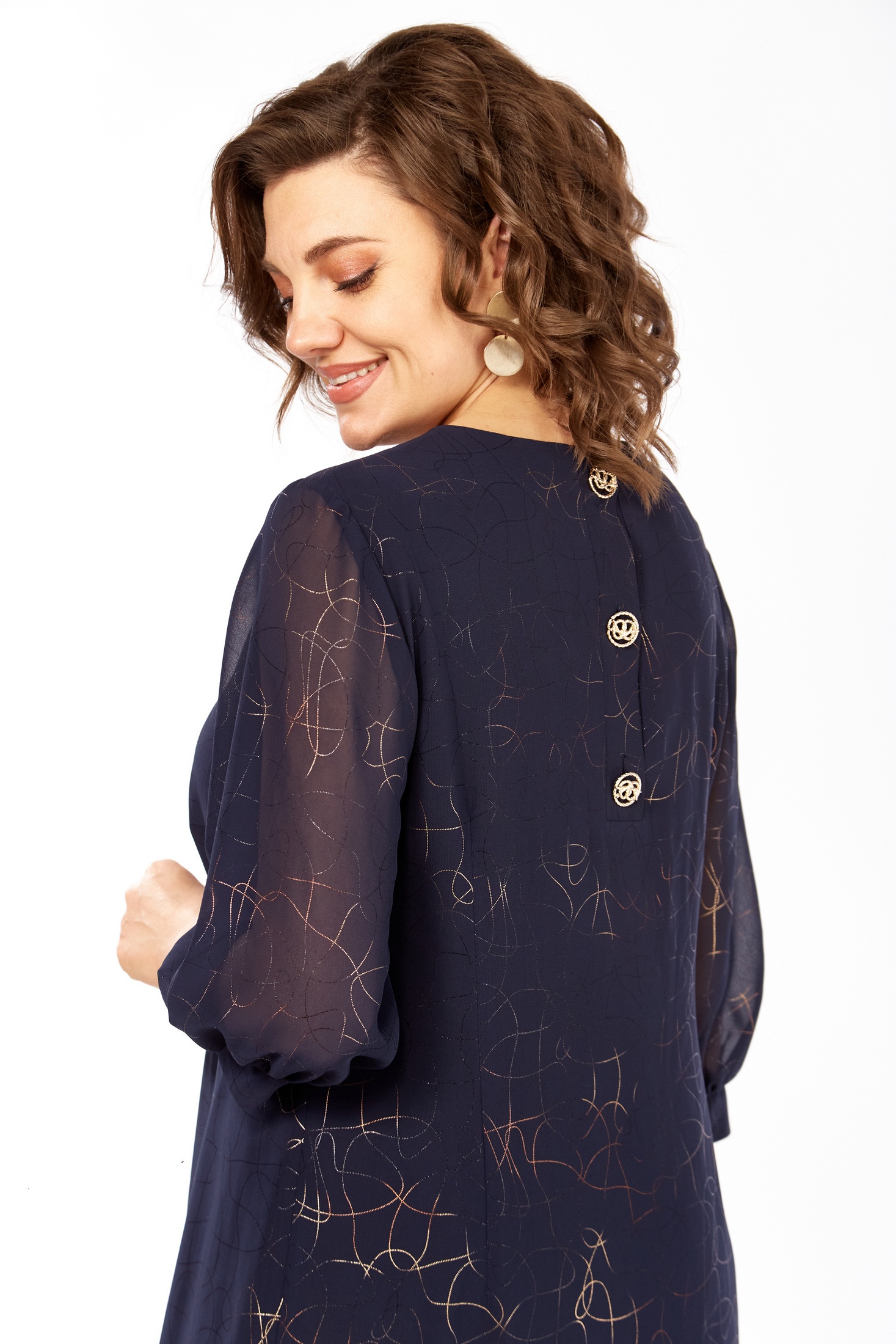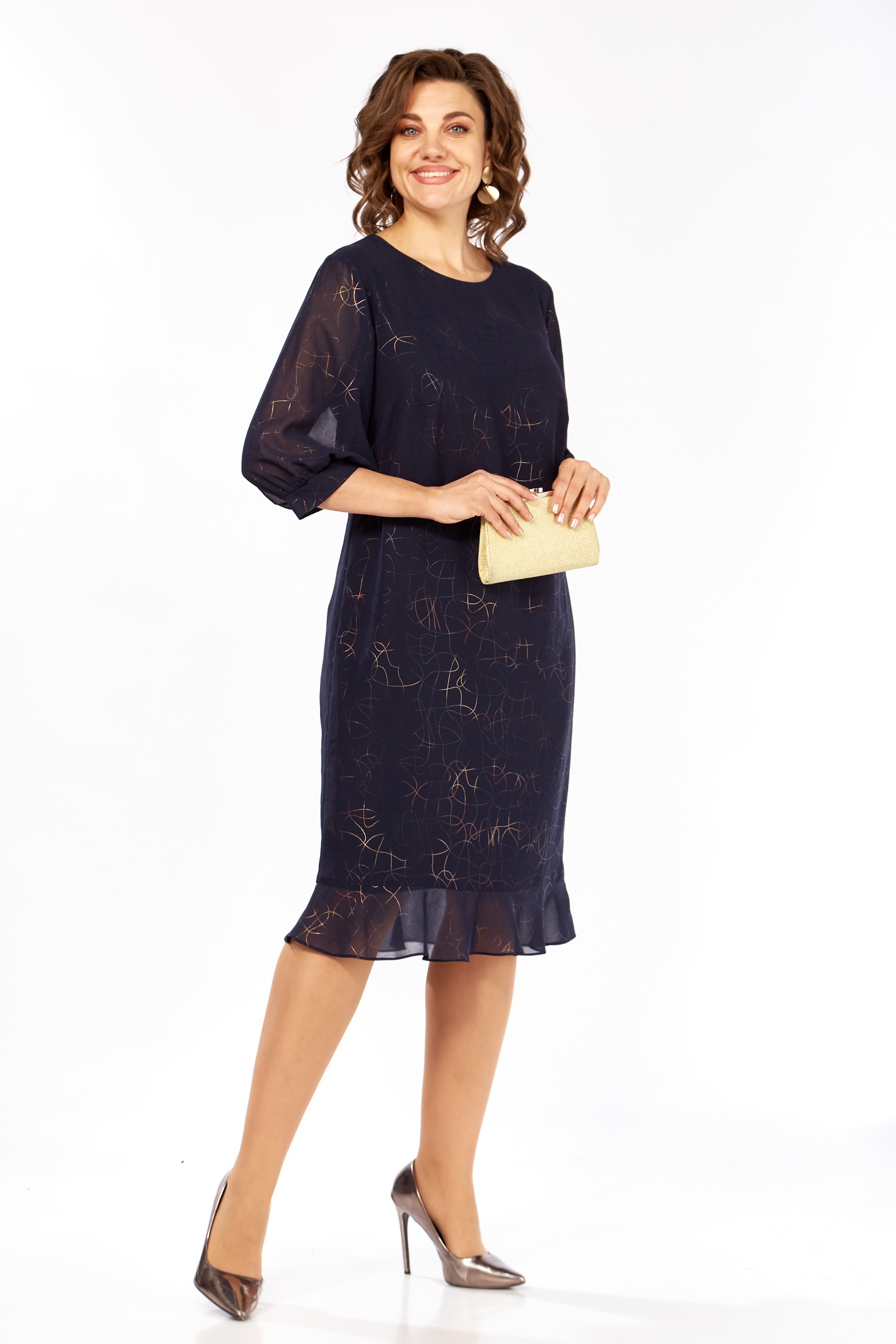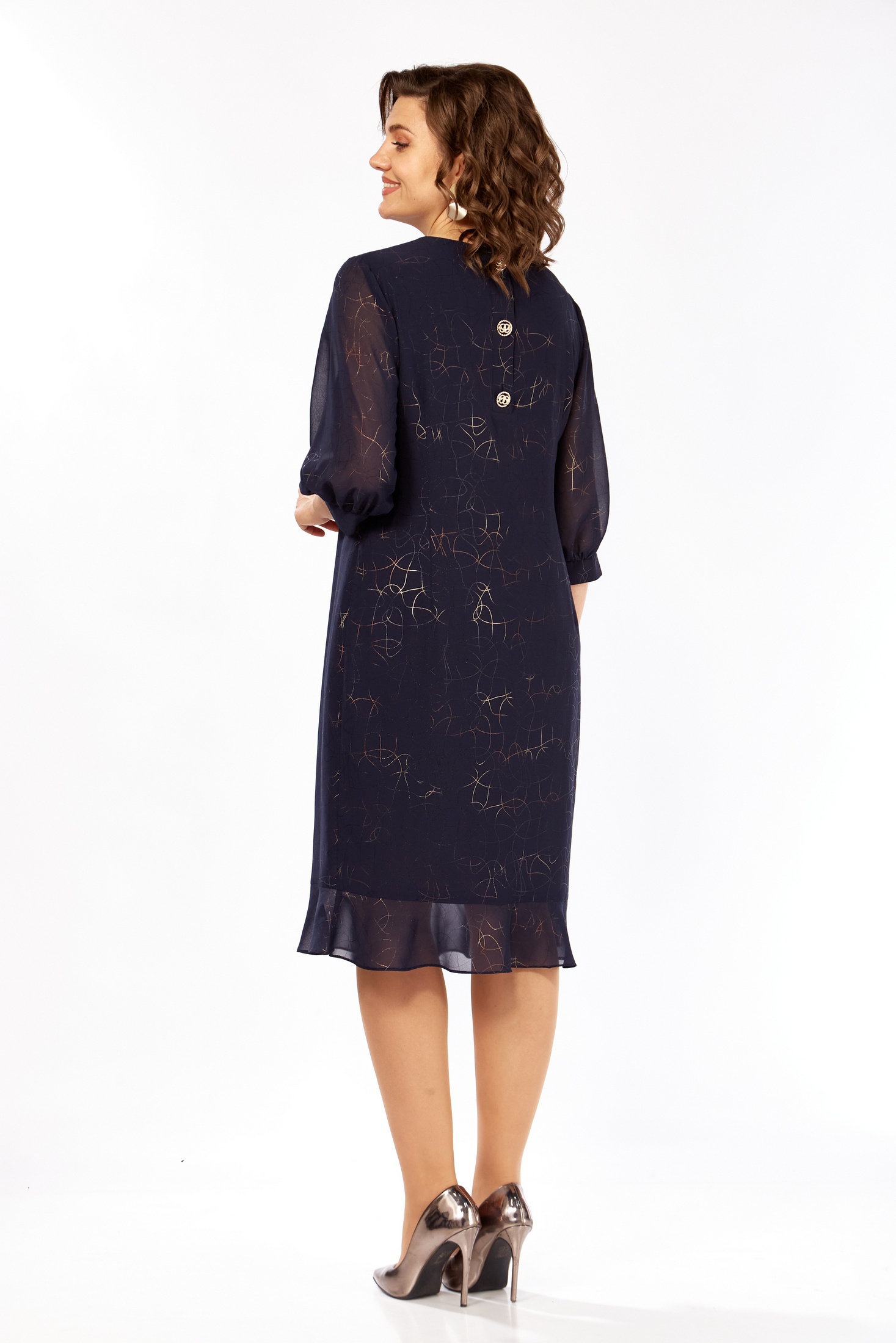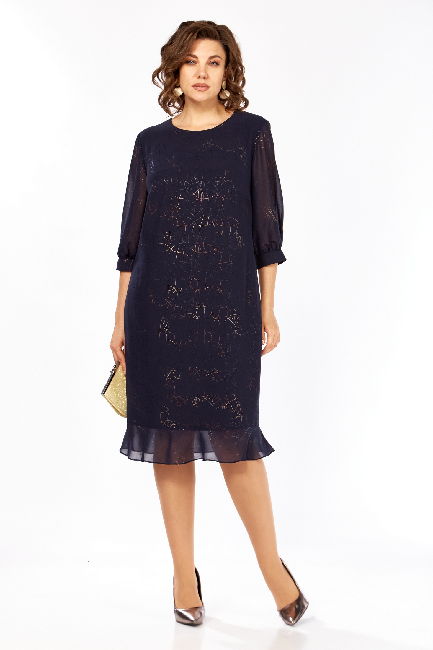 Элегантное темно-синее платье с деликатным узором в виде стилизованных золотых символов и звезд создает неповторимый образ. Этот образец женской одежды представляет собой полуприлегающий силуэт с округлым вырезом горловины и длиной 104 см, что придает модели изысканность и женственность. Притачной волан по низу добавляет легкость и игривость. Рукав втачной одношовный с манжетами длиной 42 см обеспечивает удобство и стиль. По спинке изделие застегивается на планке с пуговицами, подчеркивая внимание к деталям в дизайне. Это платье станет идеальным выбором для торжественных мероприятий и вечерних выходов.