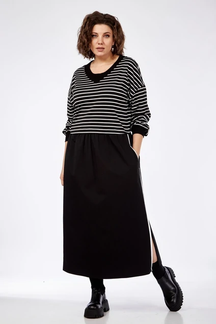 Платье женское, комбинированное из трикотажного полотна (вверх) и хлопкового ( юбка). Силуэт свободный. Линия плеча спущена. Горловина овальная обработана трикотажным довязом. Рукав длинный, низ рукава обработан довязом. По переду юбки платья два вертикальных подреза в которые вставлен отделочный кант белого цвета. Кант визуально сужает силуэт. В подрезе обработан карман. Внизу подреза разрез. Спинка без особенностей. Платье без подкладки.