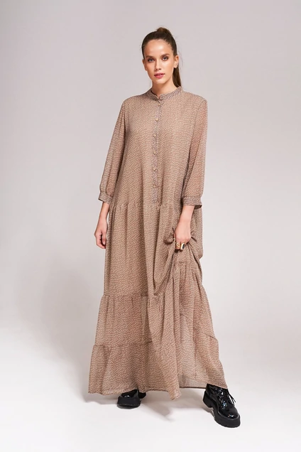 Платье свободного кроя из шифон длина макси. Верхняя часть переда с планкой которая застегивается на пуговицы. Платье с двумя воланоми на сборке.Воротник стойка. Рукав втачной со сборкой по низу с притачной манжетой. Платье на подкладке.