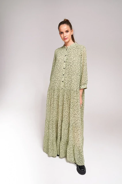 Платье свободного кроя из шифон длина макси. Верхняя часть переда с планкой которая застегивается на пуговицы. Платье с двумя воланоми на сборке.Воротник стойка. Рукав втачной со сборкой по низу с притачной манжетой. Платье на подкладке.