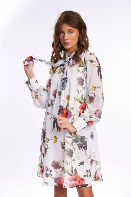 Платье свободного силуэта, расширенное к низу, выполнено из шифонового полотна с воротником-стойкой переходящим в бант. Рукава в изделии втачные одношовные со сборкой по низу с отрезной манжетой на 3 петли и пуговицы. Платье на подкладке. Ремень не входит в комплект.