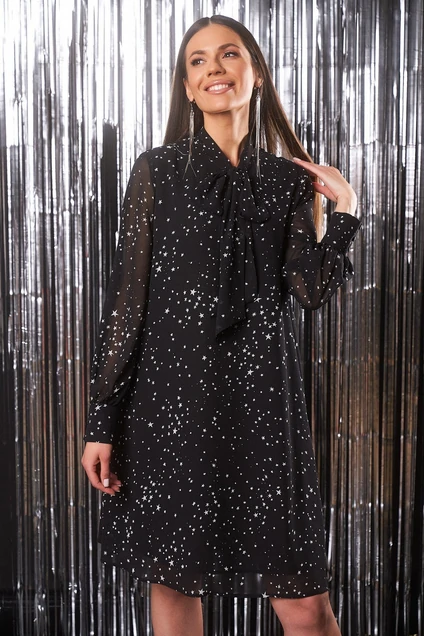 Платье свободного силуэта, расширенное к низу, выполнено из шифонового полотна с воротником-стойкой переходящим в бант. Рукава в изделии втачные одношовные со сборкой по низу с отрезной манжетой на 3 петли и пуговицы. Платье на подкладке. Ремень не входит в комплект. Длина изделия - 95 см Длина рукава - 61 см