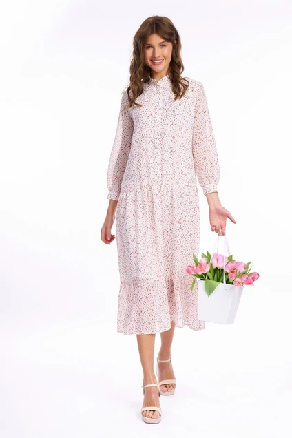 Платье свободного кроя из шифон длина миди. Верхняя часть переда с планкой которая застегивается на пуговицы. Платье с одним воланом на сборке.Воротник стойка. Рукав втачной со сборкой по низу с притачной манжетой. Платье на подкладке.