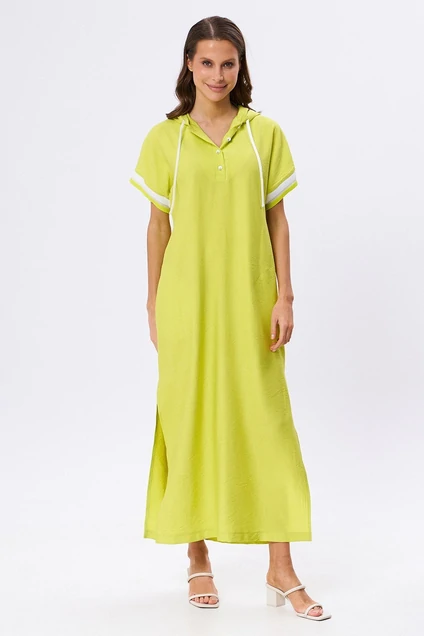 Свободное, прямое платье с капюшоном. Спущенный рукав отделан эластичным довязом в полоску. По переду застёжка в виде планки с пуговицами. В боковых швах карманы и разрезы.