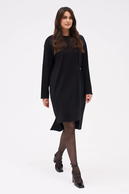 Свободное платье из тонкой экокожи и хлопка. Платье со спущенной линией плеча и рукавом 3/4. Рукава и перед изделия из экокожи. По переду идут декоративные подрезы и контрастный накладной карман из хлопка. По спинке отрезана кокетка из экокожи, а основная часть спины выполнена из контрастного хлопка с заложенными крупными складками. В боковых швах карманы. Застёжка на короткую металлическую молнию по кокетке сзади.