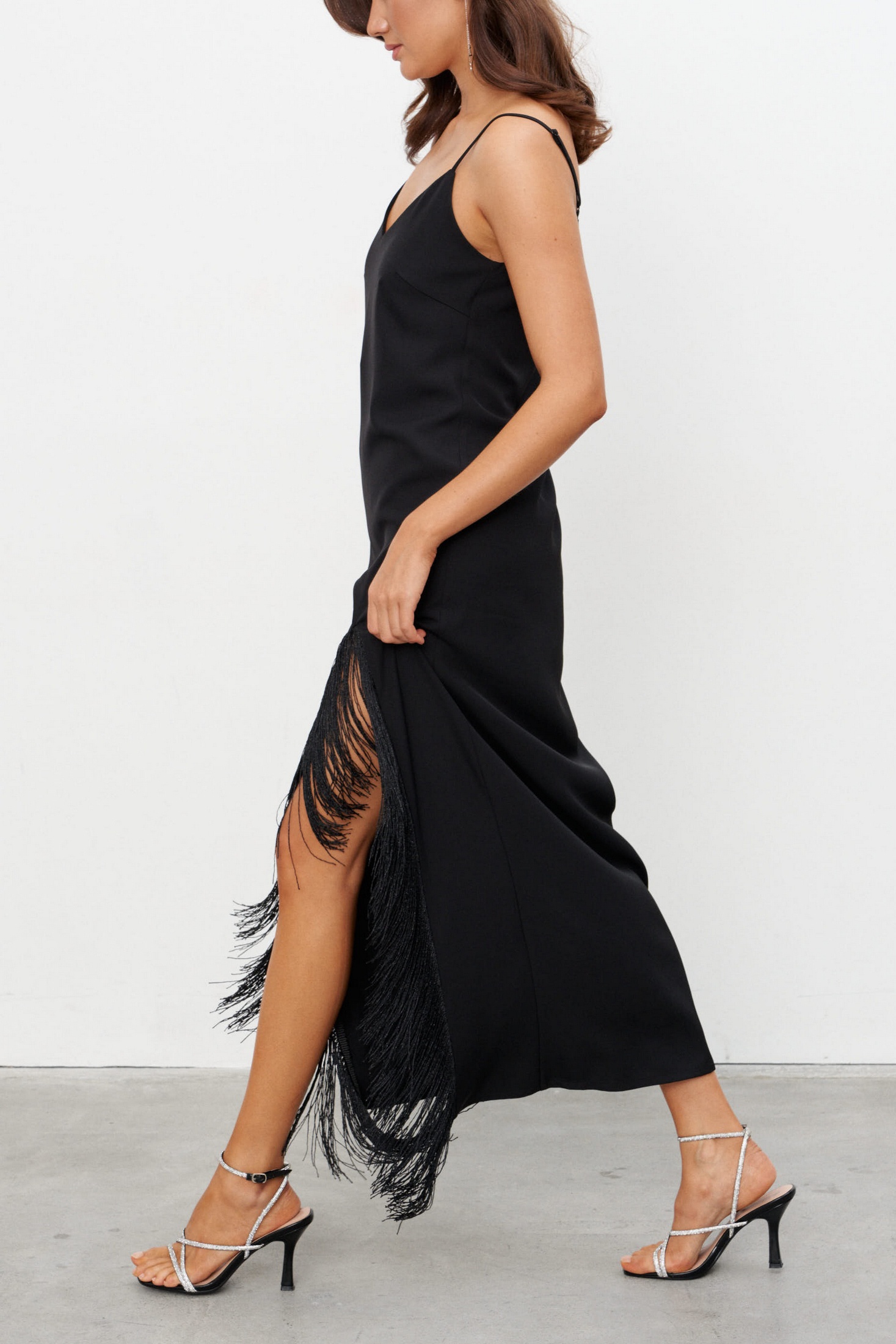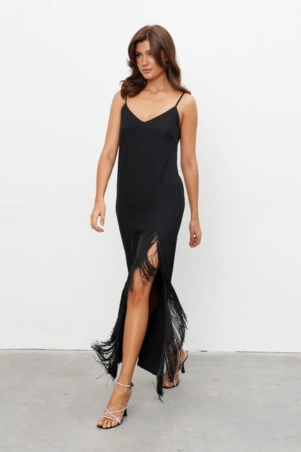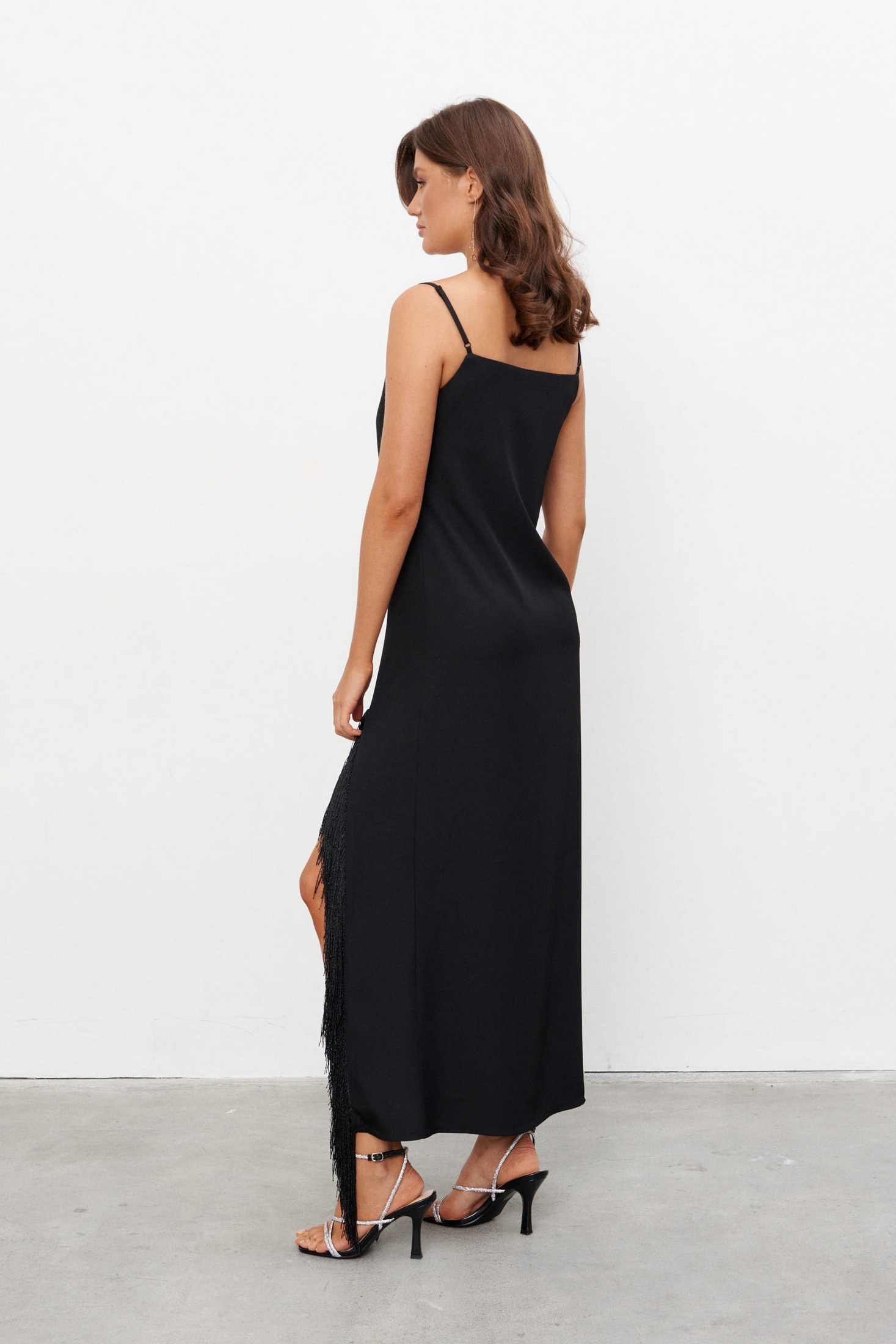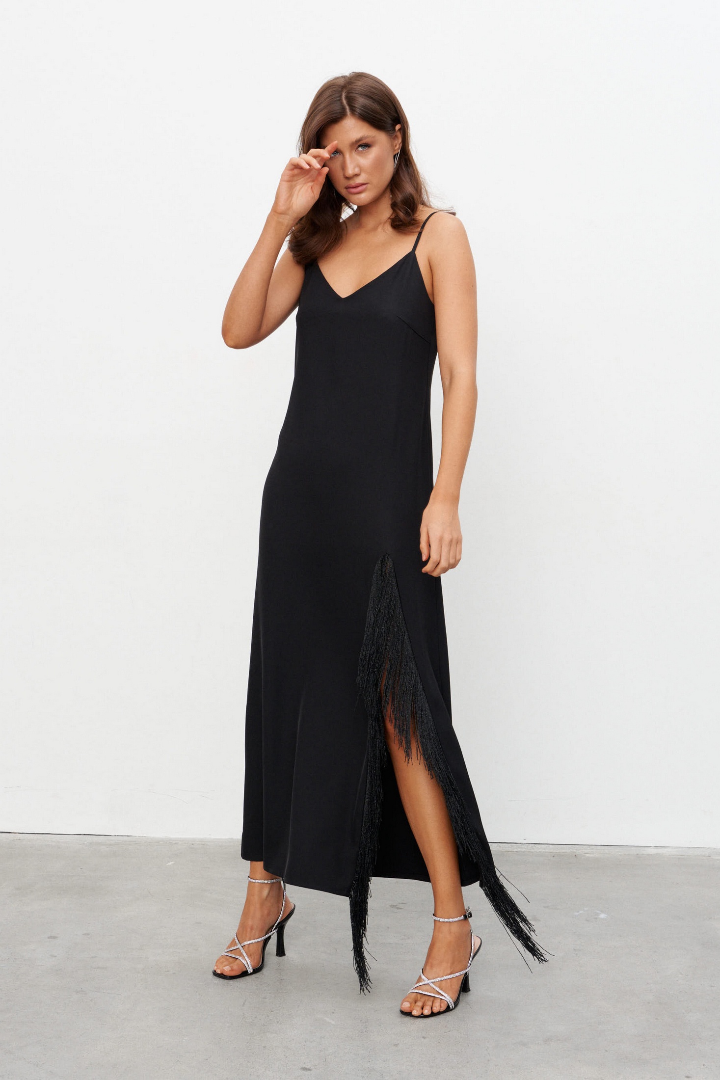 Платье-комбинация из струящейся ткани длиной макси с высоким разрезом, обрамлённым бахромой. Платье на бретелях длину которых можно регулировать. Застёжка на потайную молнию сбоку.