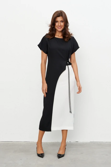 Платье длиной миди из струящейся ткани. Перед выполнен из двух контрастных деталей: Верхняя - чёрного цвета асимметричного кроя с декоративной завязкой на блестящий шнур в стразы и нижняя молочного цвета. Линия плеча спущена. Сзади разрез и застёжка на потайную молнию. Длина по середине спинки 46-50р -125 см 52-56р -126 см