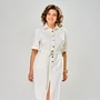 Платье прямого силуэта выполнено на сочетании однотонной ткани и полоски с декоративной имитацией жакета надетого поверх. Линия плеча спущена, рукав 3/4, в боковых швах карманы, а также спереди есть нагрудный карман и карман с клапаном.Длина 50-60р - 116 см Длина рукава 50-54р -38см 56-60р - 38,5см