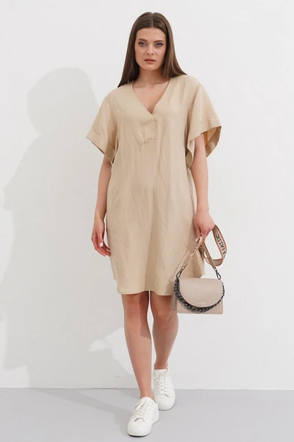 Платье прямого силуэта выполнено из льняной ткани. Характеристики: Горловина V- образная, рукав короткий втачной оформлен притачной манжетой. По переду складка, по спинке средний шов. Длина до колена.