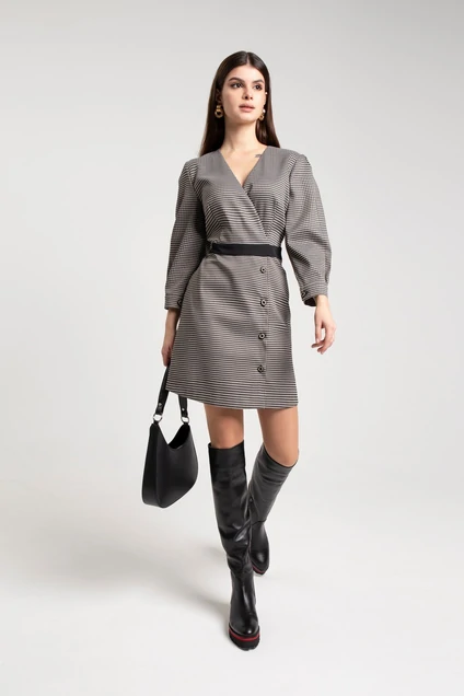 Платье прилегающего силуэта из плотной поливискозы, рукав 3/4, длина платья по спинке 87 см, в боковом шве потайная молния, юбка на запах, застёгивающийся на 4 пуговицы. Длина 87 см