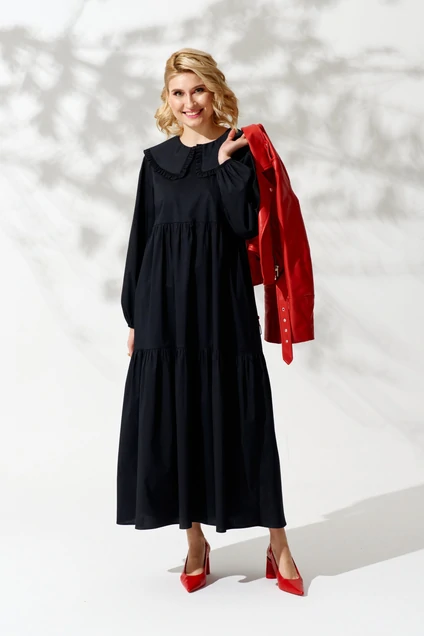 Длинное платье с воротником. Длина платья до щиколотки. Воротник аккуратный, со сборкой. По переду расположено два яруса воланов со сборкой. Рукав пышный, длинный, на резинке по низу. По спинке так же расположено два яруса воланов со сборкой. В верхней части спинки расположен средний шов, заканчивающийся вырезом, на котором расположена застежка на петлю - пуговицу. В боковых швах платья расположены карманы. Преимущества кроя этого платья в том, что такой силуэт скроет все недостатки вашей фигуры, но при этом вы останетесь женственной и хрупкой. Его можно носить как с поясом, так и без. Платье с воротником прекрасно подходит молодым девушкам, оно смотрится весьма кокетливо и романтично. Женщинам постарше такие платья тоже пригодятся: с их помощью можно легко убавить от своего возраста в глазах окружающих несколько лет и почувствовать себя моложе. Такое платье прекрасно подойдет для свидания, в нем можно отправиться на прогулку или в кафе. Воротник - уместная деталь и в модном офисном гардеробе. Ремень в комплект платья не входит.