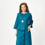 Нарядное женское платье из тонкой непрозрачной ткани с добавлением вискозы. Силуэт расширенный к низу. Длина чуть ниже колена. По переду от плеча ассиметричные детали из ткани контрастных цветов. Рукав короткий. Невысокий воротник хомут с застежкой по спинке на навесную петлю с пуговицей.