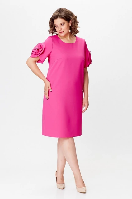 Нарядное женское платье из стрейчевой ткани с добавлением вискозы, прямого силуэта, длиной до середины колена. Вырез горловины круглый с застежкой на потайную молнию по спинке. Оригинальность платью придает конструкция рукава в виде цыветка с декоративной пуговицей в центре.