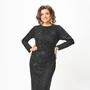 Нардное женское платье из трикотажного полотна с добавлением хлопка и метонити. Силуэт прямой с заужением к низу, длина чуть ниже колена, вырез горловины У-образный с планкой, линия плеча слегка опущена, от горловины по всей длине рукава вставлены две узких полоски из блестящей отделочной ткани.