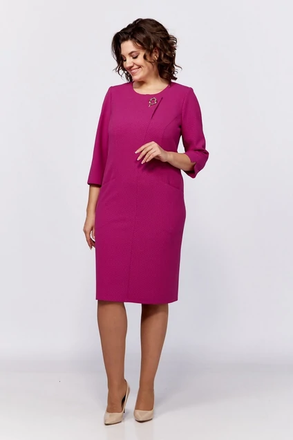 Нарядное женское платье из ткани средней плотности с добавлением вискозы. Нарядность платью придает фактура ткани - рубчик по диагонали. Силуэт полуприлегающий, длина чуть ниже колена, вырез горловины круглый с застежкой на потайную молнию по спинке. По переду функциональные карманы в рельефах. По центру переда на уровне груди фигурная отлетная деталь имитирующая застежку с декоративной брошью. По спинке в среднем шве невысокий разрез. Рукав 3/4 с небольшим разрезом по низу.