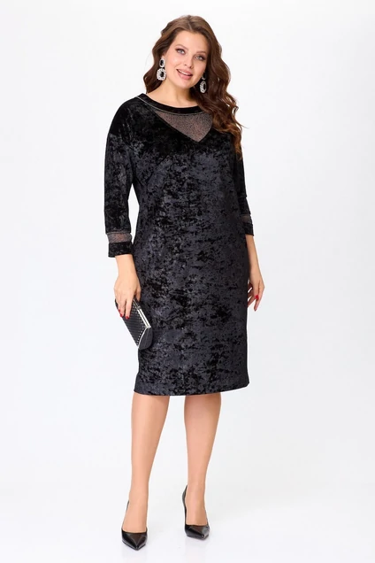 Нарядное женское платье из стрейчевого бархатного полотна с мерцающим рисунком, прямого силуэта, длиной чуть ниже колена, линия плеча слегка опущена, рукав длиной 7/8. Вырез горловины круглый с застежкой на пуговицу по спинке.По переду платья вставка из прозрачной мерцающей сетки и планка с декоративной тесьмой. По низу рукава также вставка из аналогичной сетки с декоративной тесьмой. По спинке в среднем шве разрез.