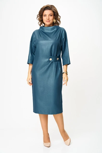 Нарядное женское платье из плательной ткани с легким блеском. Силуэт прямой, длина чуть ниже колена, с невысокой цельнокроеной стойкой. Линия плеча слегка опущена, рукав 3/4, по переду ассиметричные складки на уровне талии, с отлетной деталью в виде пояса, украшенного большими декоративными пуговицами, по спинке в среднем шве разрез.
