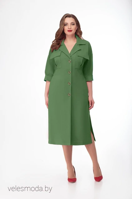 Платье прямого силуэта в стиле сафари,застежка на петли пуговицы.Спущенная линия плеча.Низ рукава с приточным манжетом. Воротник пиджачного типа на отрезной стойке.В верхней части полочки накладные карманы со встречной складкой и клапаном.В боковых швах платья карманы высокие разрезы.Платье дополнено поясом.