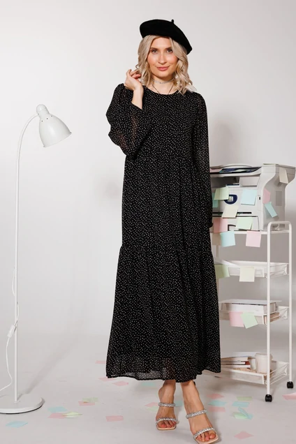 Принтованное платье свободного силуэта со сборками в пол. Рукав на резинке для удобства при носке. Романтичное настроение и игривая походка - это то, что подарит вам это платье. Платье выполнено из шифона с дизайнерским принтом "горошек" в ретро тонах. На подкладке. Длина изделия – 130 см.