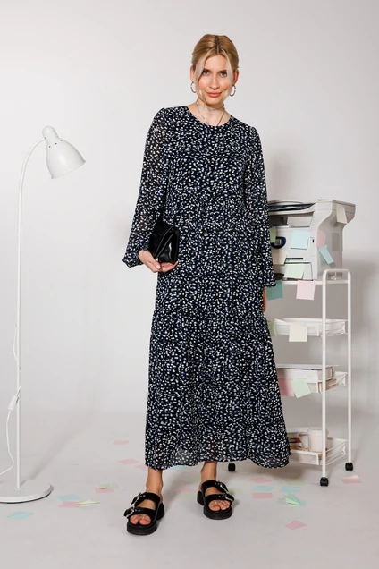 Принтованное легкое платье со сборкой в пол. Рукав на резинке, что позволит вам не чувствовать дискомфорт при носке. Платье выполнено из шифона с дизайнерским принтом "дражже" в синих тонах. На подкладке. Длина – 130 см.