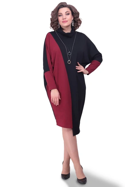 Горловина слегка расширена, воротник хомут. Рукав летучая мышь с отрезной нижней частью. Низ платья фигурный. Спинка со средним швом. В боковом шве снизу для удобства вставлена потайная молния. Украшение вкомплект не входит.