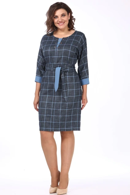 Платье женское, прямого силуэта, с цельнокроенными короткими рукавами, по низу с отделочными деталями. Круглый вырез горловины переходит в разрез по переду, со вставкой из отделочного материала и пришитыми пуговицами. Детали переда и спинки со средним швом. Платье комплектуется съемным поясом из основного и отделочного материалов. Размеры 46-50: длина платья 97 см, длина рукава 12 см. Размеры 52-56: длина платья 99 см, длина рукава 14 см