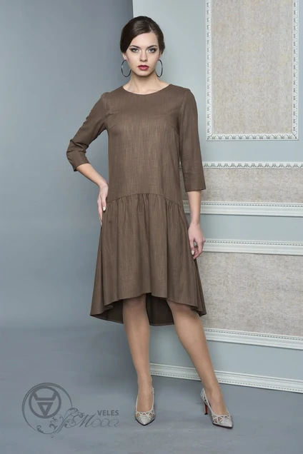 Платье прямого силуэта с круглым вырезом горловины. Перед с нагрудными вытачками и воланом по низу. Спинка со средним швом и фигурным воланом по низу. Волан спинки длиннее волана полочки. В среднем шве потайная тесьма - "молния". Рукава втачные, одношовные, длиной 3/4. Размеры 42-46: длина изделия 104 см, длина рукава изделия 44 см. Размеры 48-52: длина изделия 106 см, длина рукава изделия 47 см.
