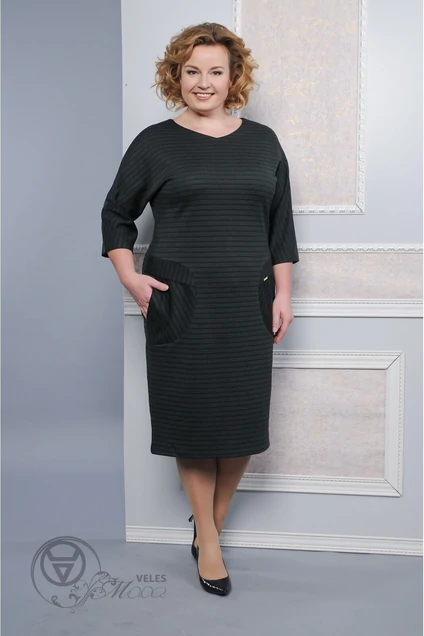 Платье трикотажное прямого силуэта, с полукруглым вырезом горловины и цельнокроенными рукавами, длиной 3/4. Перед с фигурными карманами. На левом кармане пришита отделочная пластина. Спинка со средним швом. Размеры 48-52: длина изд.101 см, длина рукава 44 см. Размеры 54-58: длина изд.106 см, длина рукава 45 см.