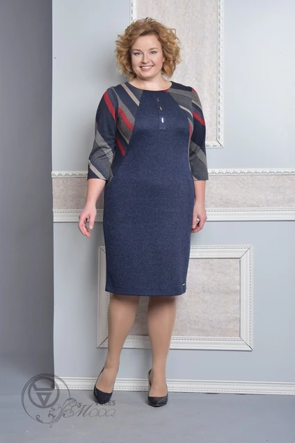 Платье прямого силуэта с полукруглым вырезом горловины. Перед с отрезными бочками и настрочной планкой по центру. По горловине отрезная деталь. По планке и низу переда пришиты отделочные пластинки. Спинка с отрезными бочками и средним швом. В шве потайная тесьма-"молния" и разрез. Рукава втачные, одношовные, длиной 3/4. Размеры 52-56 : Длина изделия 100 см, длина рукава 45 см. Размеры 58-62 : Длина изделия 103 см, длина рукава 52 см.