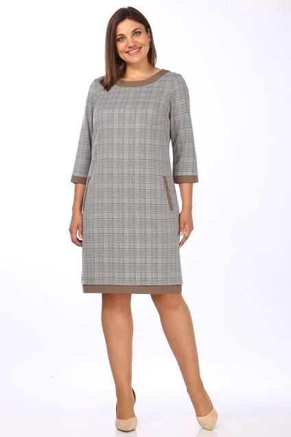 Платье прямого силуэта с круглым вырезом горловины и отрезной деталью по горловине. Перед с нагрудными вытачками и прорезными карманами с листочками. На листочках пришиты отделочные пластинки. Спинка со средним швом, в шве металлическая тесьма - "молния". По низу платья отрезная деталь из отделочной ткани. Рукава втачные, одношовные, длинной 3/4. По низу рукавов притачные манжеты. Размеры 48-52: длина изделия 94 см, длина рукава 46 см. Размеры 54-58: длина изделия 99 см, длина рукава 46 см