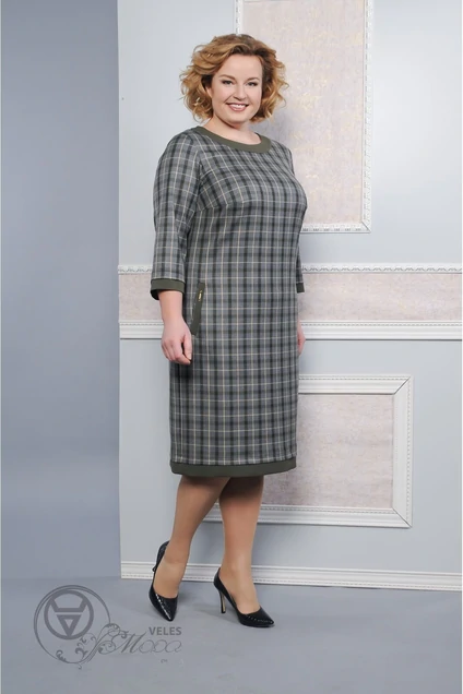 Платье прямого силуэта с круглым вырезом горловины и отрезной деталью по горловине. Перед с нагрудными вытачками и прорезными карманами с листочками. На листочках пришиты отделочные пластинки. Спинка со средним швом, в шве металлическая тесьма - "молния". По низу платья отрезная деталь из отделочной ткани. Рукава втачные, одношовные, длиной 3/4. По низу рукавов притачные манжеты. Рзамеры 48-52: длина изд. 95 см, длина рукава 47 см. Размеры 54-58: длина изд.102 см, длина рукава 46 см. Размеры 60-64: длина изд.104 см, длина рукава 48 см.