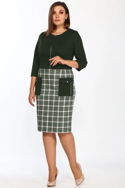 Платье женское полуприлегающего силуэта, для повседневной носки. С круглым вырезом горловины, центральной застежкой на металлическую тесьму "молнию" до линии талии. Детали переда с нагрудными и талиевыми вытачками. Платье отрезное по линии талии. Переднее полотнище юбки с накладными карманами с молнией и клапанами, застегивающимися на петлю и пуговицу. Спинка со средним швом, в нижней части которого обработан разрез. Верхняя часть спинки и юбка с талиевыми вытачками. В левом боковом шве обработана потайная застежка на тесьму - "молнию". Рукава втачные, одношовные, длинной 3/4. Верхняя часть платья и карманы из трикотажного полотна. Размеры 48-52: длина платья 104 см, длина рукава 48 см. Размеры 54-58: длина платья 106 см, длина рукава 49 см