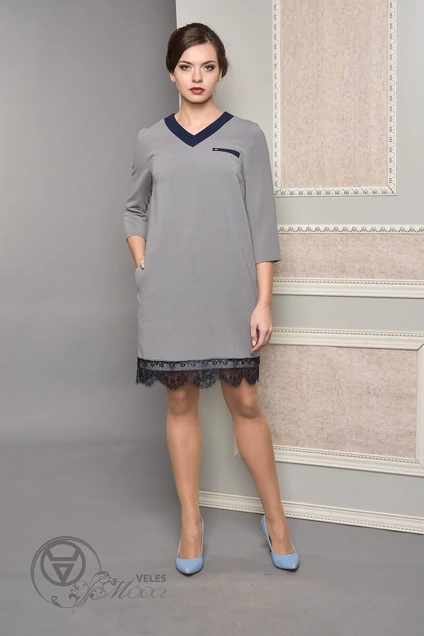 Платье прямого силуэта с круглым вырезом горловины по спинке и V-образным по переду. По горловине отрезная деталь из отделочной ткани. Перед с нагрудными вытачками и листочкой на левой стороне из отделочной ткани. На листочке пришита отделочная пластинка. Спинка со средним швом. В шве потайная тесьма-"молния". По низу платья настрочено кружево. В боковых швах обработаны карманы. Рукава втачные, одношовные, длиной 3/4. Длина изделия 88 см, длина рукава изделия 47см.