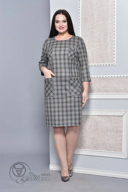 Платье полуприлегающего силуэта с круглым вырезом горловины. Перед с нагрудными и талиевыми вытачками и накладными карманами. Карманы с отрезной деталью по верхнему срезу и пуговицами. Нижние карманы входят в боковые швы. Спинка со средним швом и талиевыми вытачками. В среднем шве потайная тесьма-"молния". Рукава втачные, одношовные, длиной 3/4. Размеры 42-46: длина изделия 89 см, длина рукава изделия 46 см. Размеры 48-52: длина изделия 94 см, длина рукава изделия 46 см.
