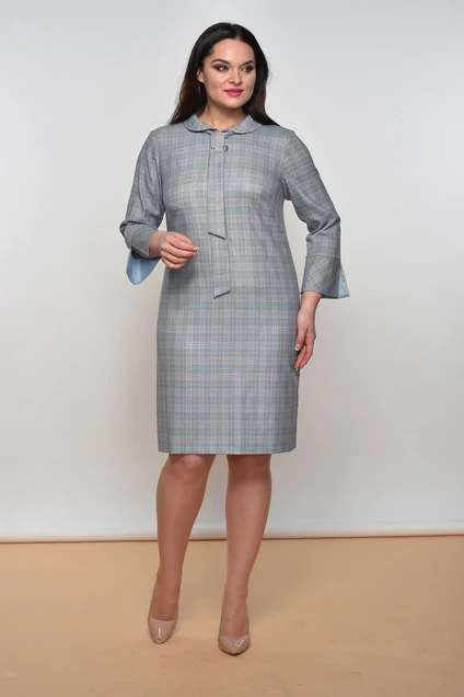 Платье полуприлегающего силуэта с круглым вырезом горловины, обработанной отрезной стойкой и отложным круглым воротником рубашечного типа. По стойке на спинке застежка на навесную петлю и пуговицу. Перед с нагрудными вытачками. Спинка со средним швом и талиевыми вытачками. В шве потайная тесьма - молния. Рукава втачные, одношовные, длиной 3/4. По низу рукавов манжеты с разрезами. Платье со съемным галстуком. На галстуке брошь. Размеры 48-52: длина изделия 93 см, длина рукава 55 см.