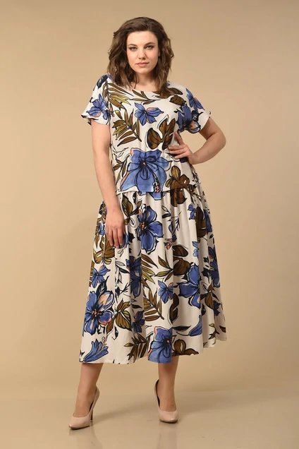 Платье А-силуэта, с круглым вырезом горловины отрезное ниже линии талии. По лифу переда и спинки расположена кулиска на уровне линии талии, нижние детали со сборкой в боковых швах - карманы. Рукава цельнокроеные, короткие. Размеры 48-52: длина платья 130 см, длина рукава 20 см. Размеры 54-58: длина платья 133 см, длина рукава 21 см